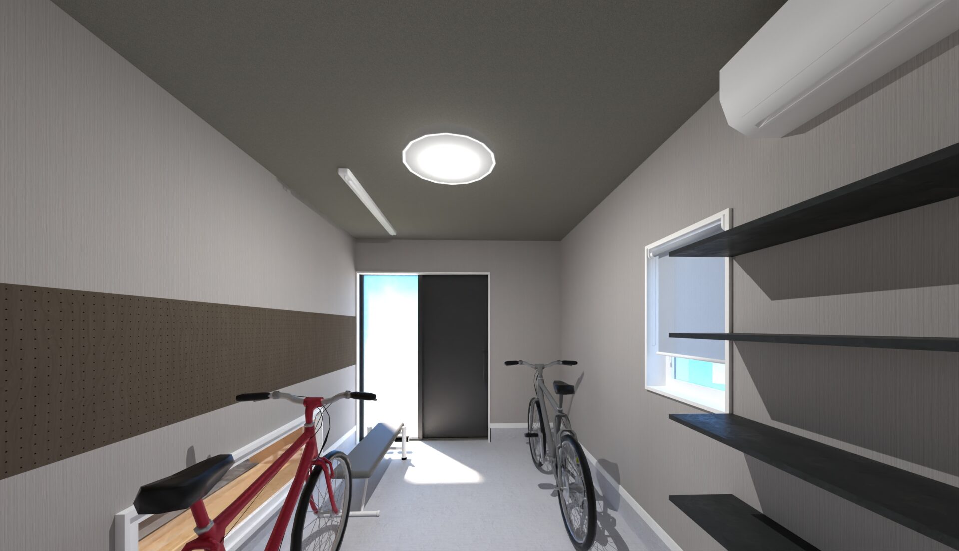 玄関土間を広く取り、ロードバイクの整備や筋トレなど、趣味を楽しめる空間に。
