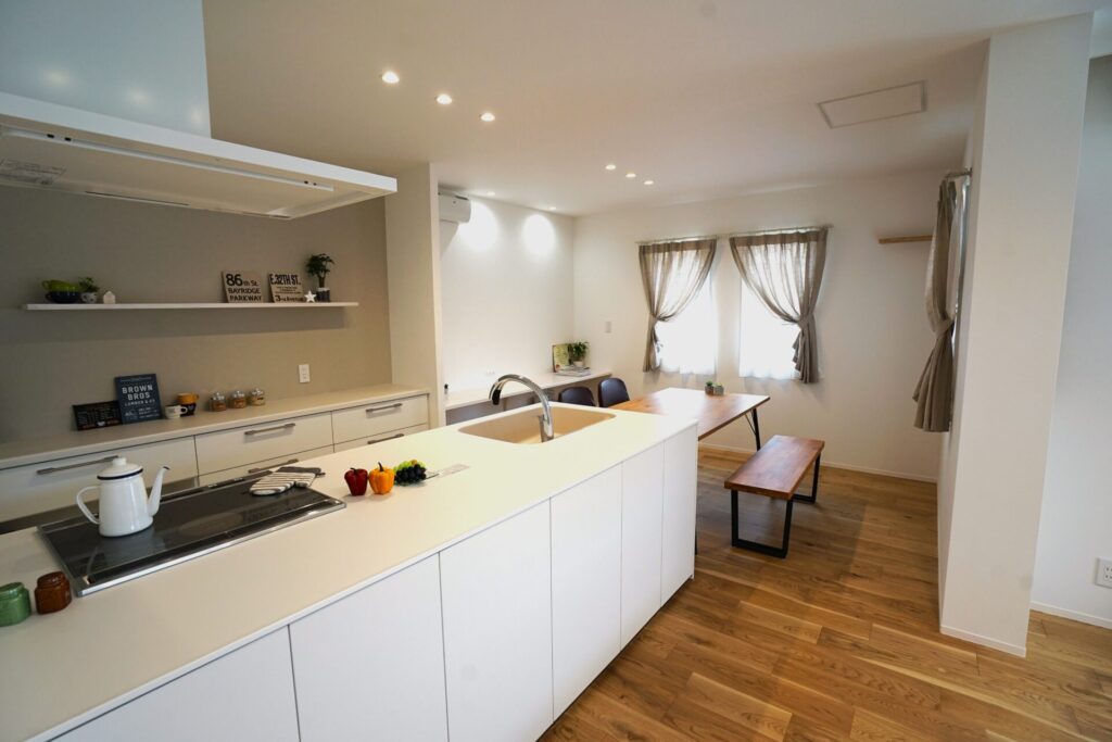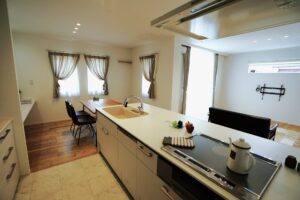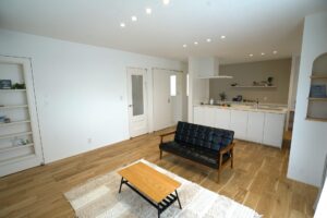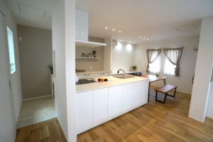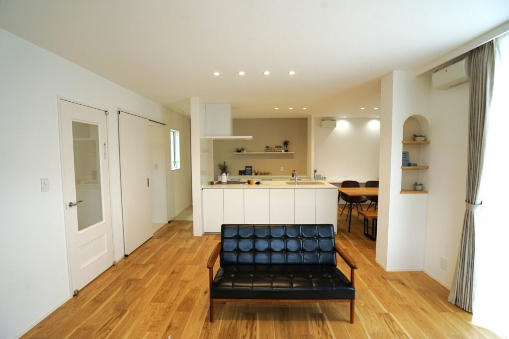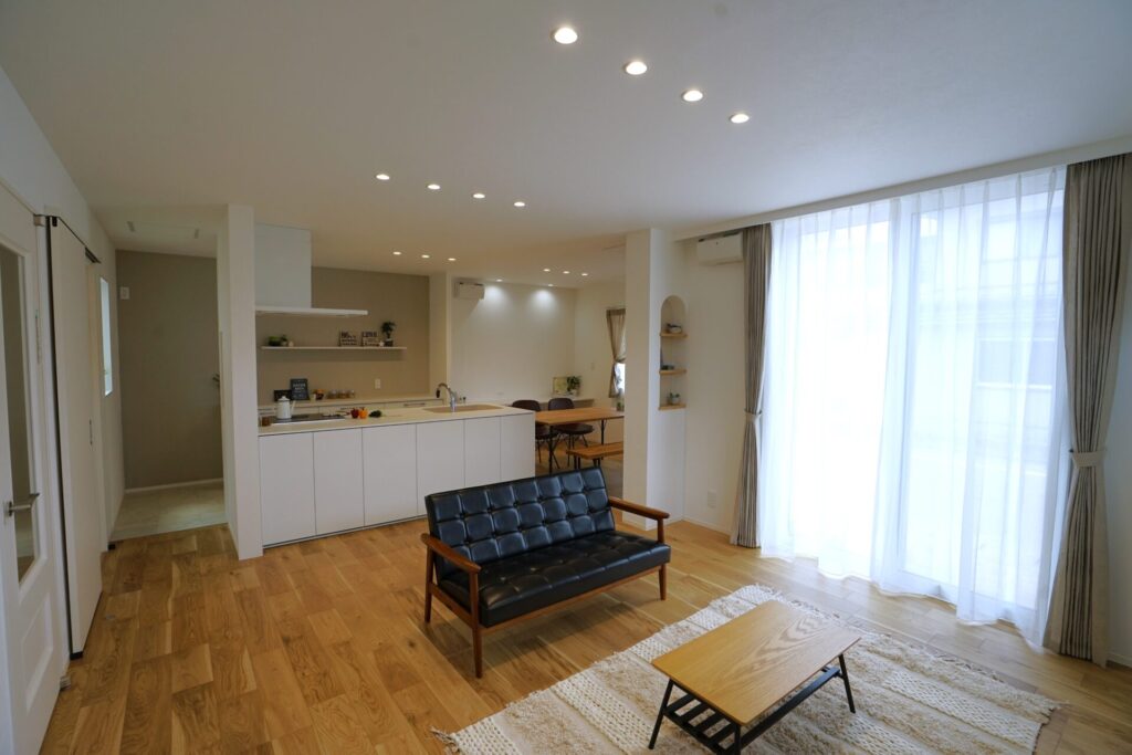 家族が心も身体もリラックスさせてくつろげる場所の提案です。隣家や道行く人など視線が気にならないように、目隠しウッドフェンスや窓の配置、家の配置など工夫しました。一日中あふれる光と風が降り注ぐリビングは人の目を気にすることなく、終日はリラックスしたスタイルで過ごせます。