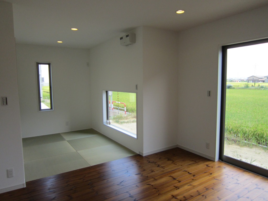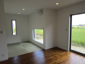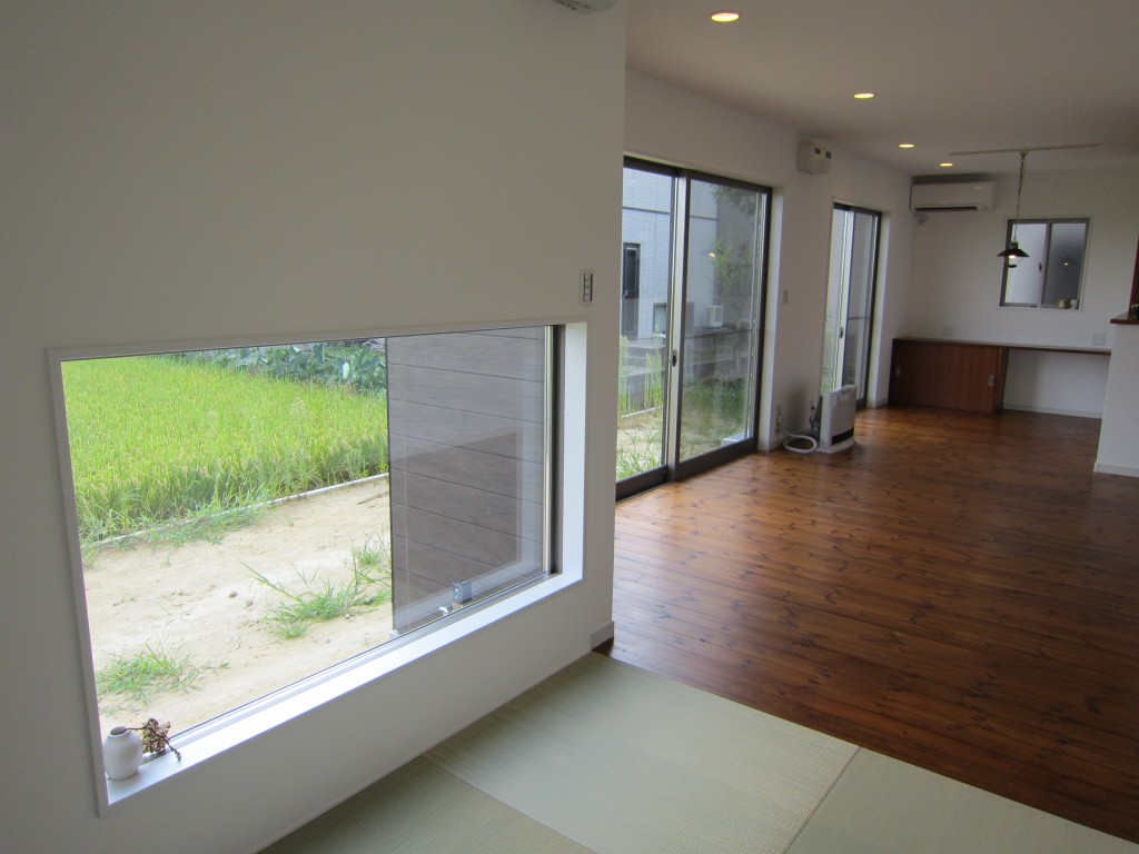 面積以上の開放感と明るさが感じられるT様邸。全部屋を明るい庭に配し、大開口の窓で庭とも一体化を持たせた設計にしました。庭はプライバシーを確保出来る様にし、休日は仲間とバーベキューを愉しめます。