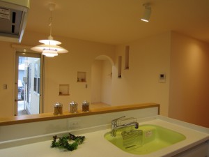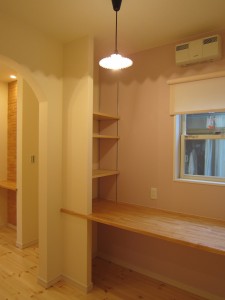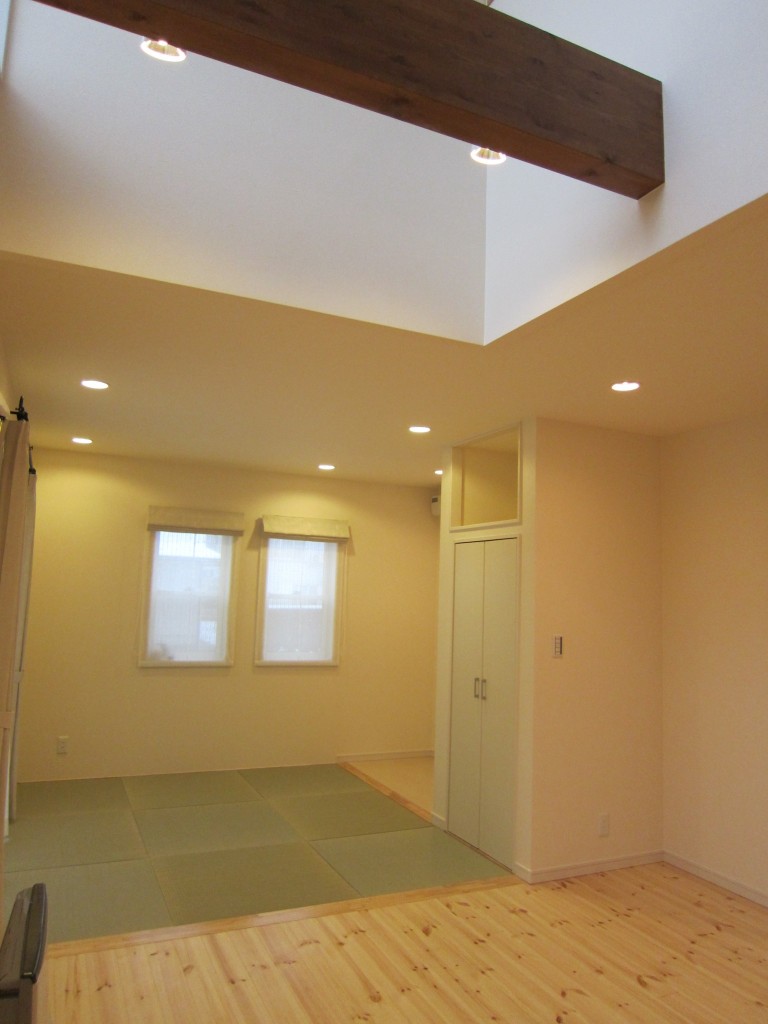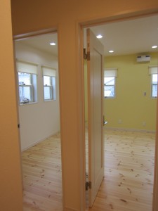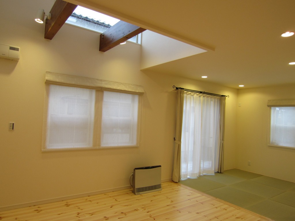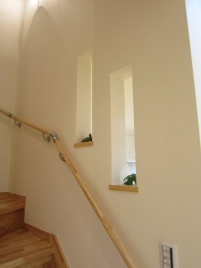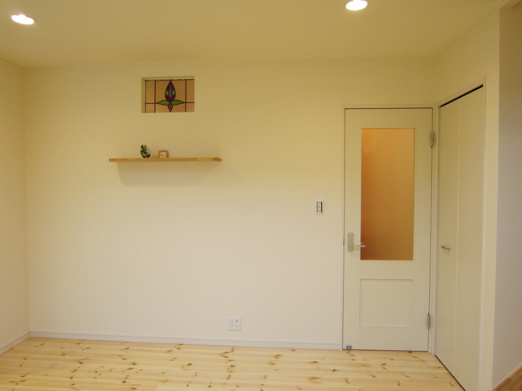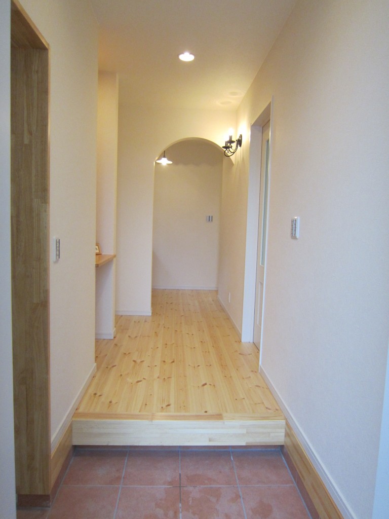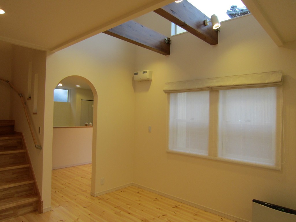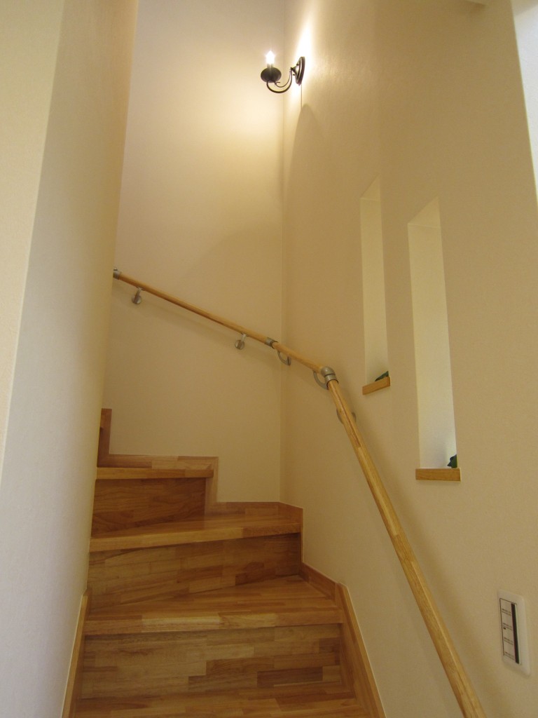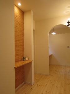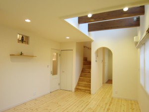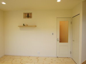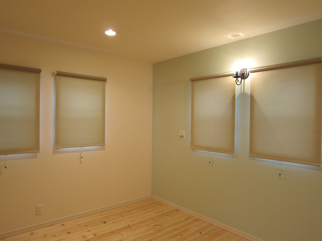 上下窓から眺める緑が美しく、渡る風も爽やかなTさんの住まいです。全お部屋が自然素材のパイン材のフローリングが心地よく、照明がやさしく壁を照らし、壁の陰影をさらに美しく演出しています。
