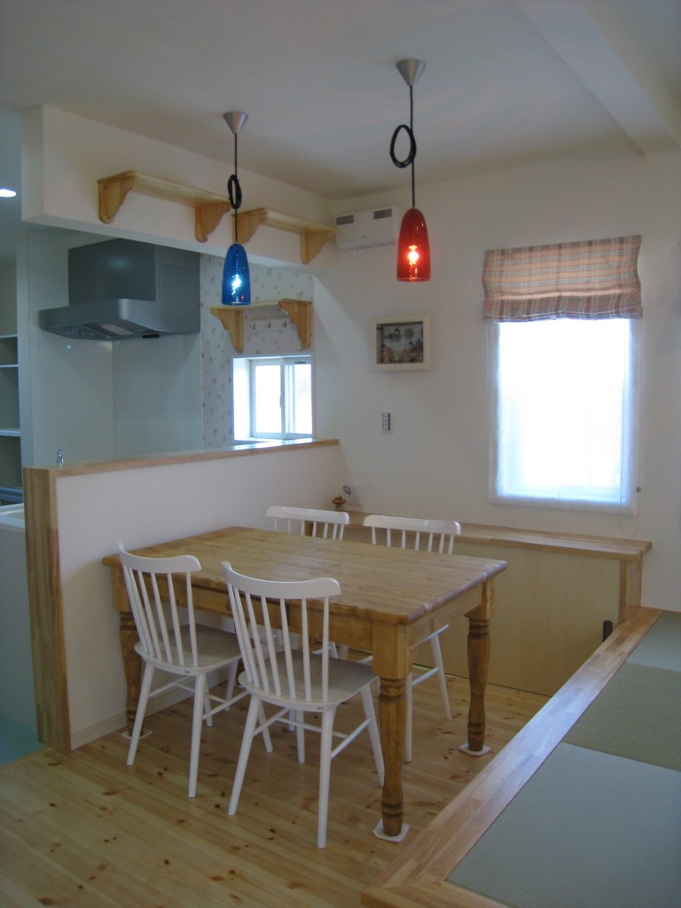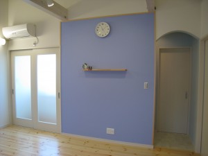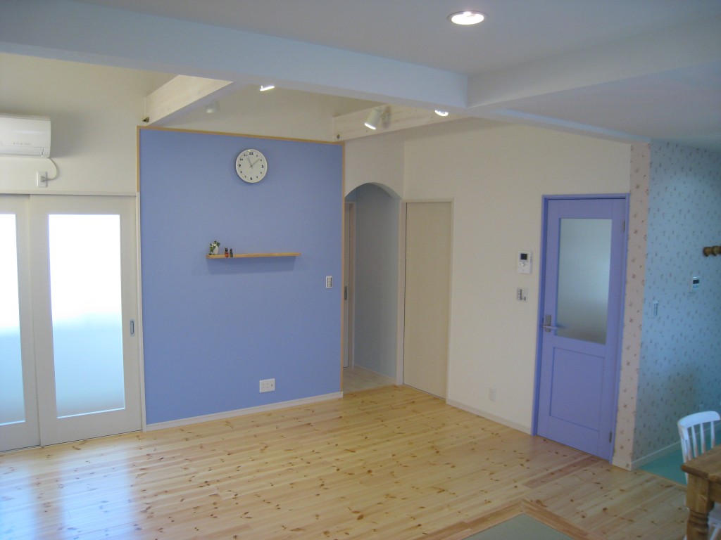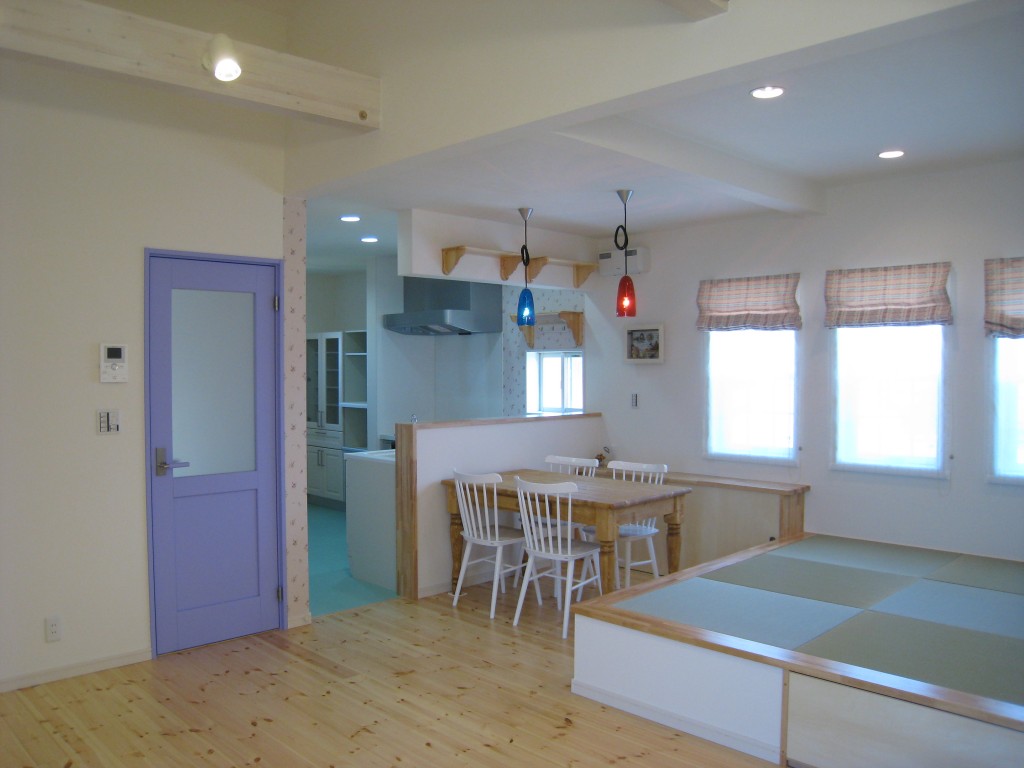 温もりのある自然素材を活かした、心地よい住まいを作りました。床は無垢のパイン材、勾配天井には無垢の梁や火打ち梁、リビングの無垢ドアはパープルのドアで印象的です。