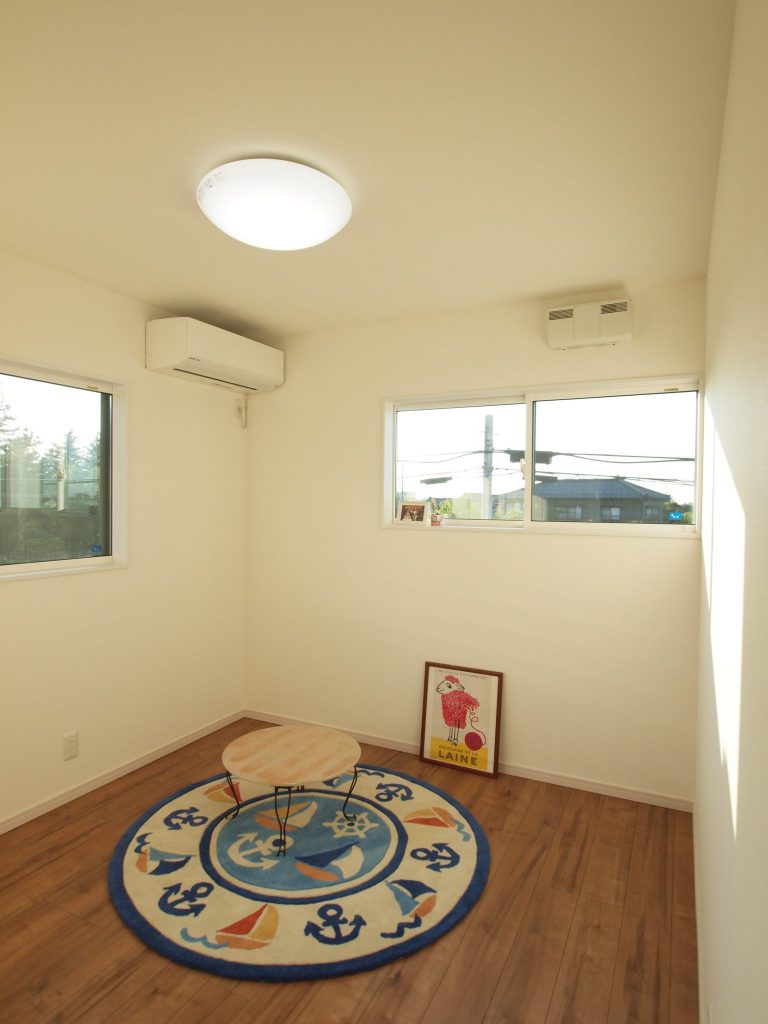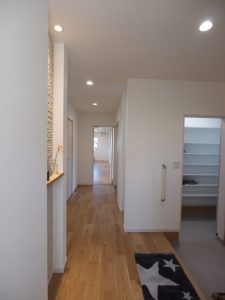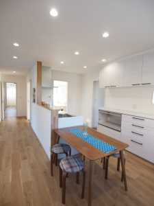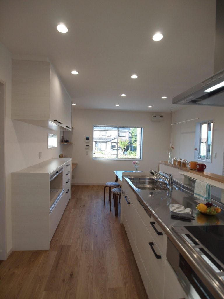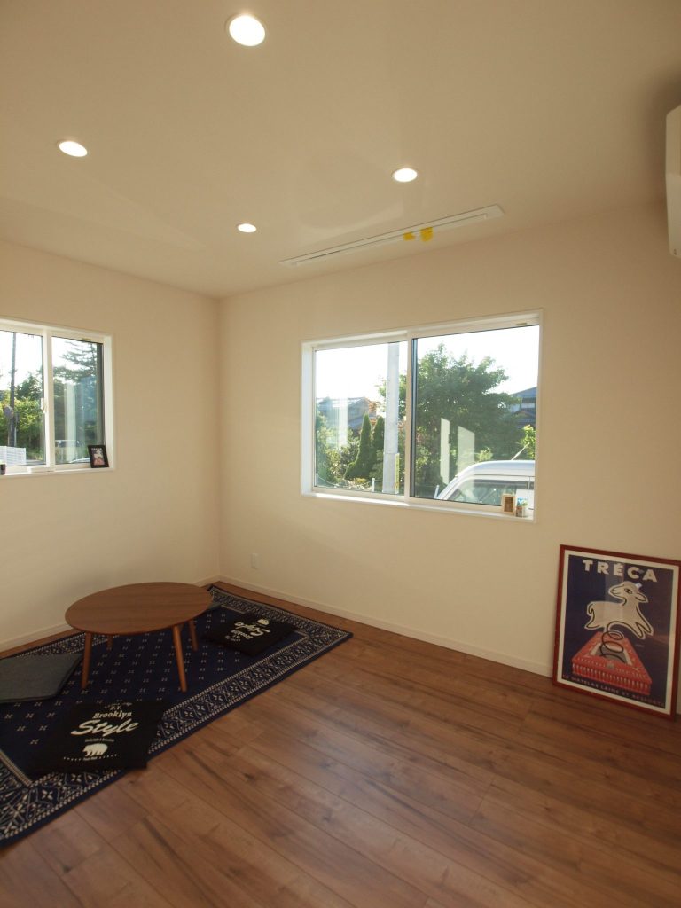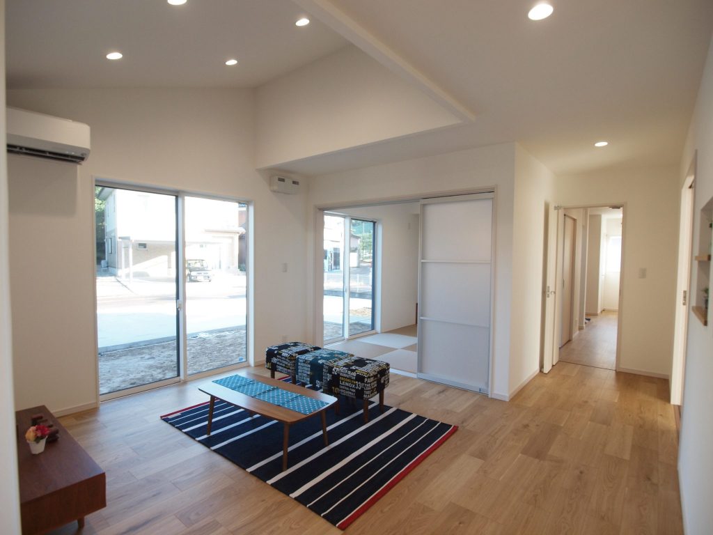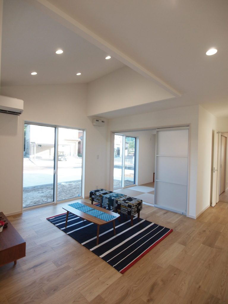 窓外の縁が鮮やかで無垢の床材一面に光が拡散して、ナチュラルな美しさを湛えるH様のお住まい。広々と開放的な敷地に開放的で風通しの良い住まいを提案しました。窓や引戸を開け放つと、夏場は風が家の中を拭き抜けるつくりにしました。