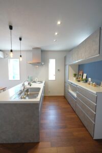 変形敷地を有効活用したデザイン性の高いプランは暮らしを生き生きとと活性化する。リビング延長のウッドデッキと庭はリビングから景観として楽しめます。リビング勾配天井は空間を演出し、キッチン近くの階段は家族それぞれがお互いの気配を感じながらのびやかに暮らせます。