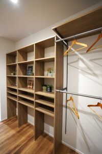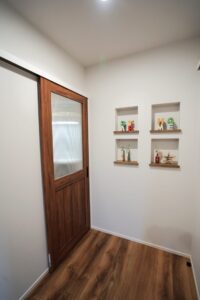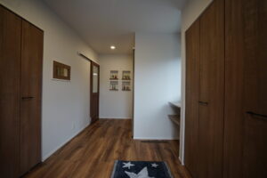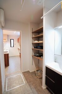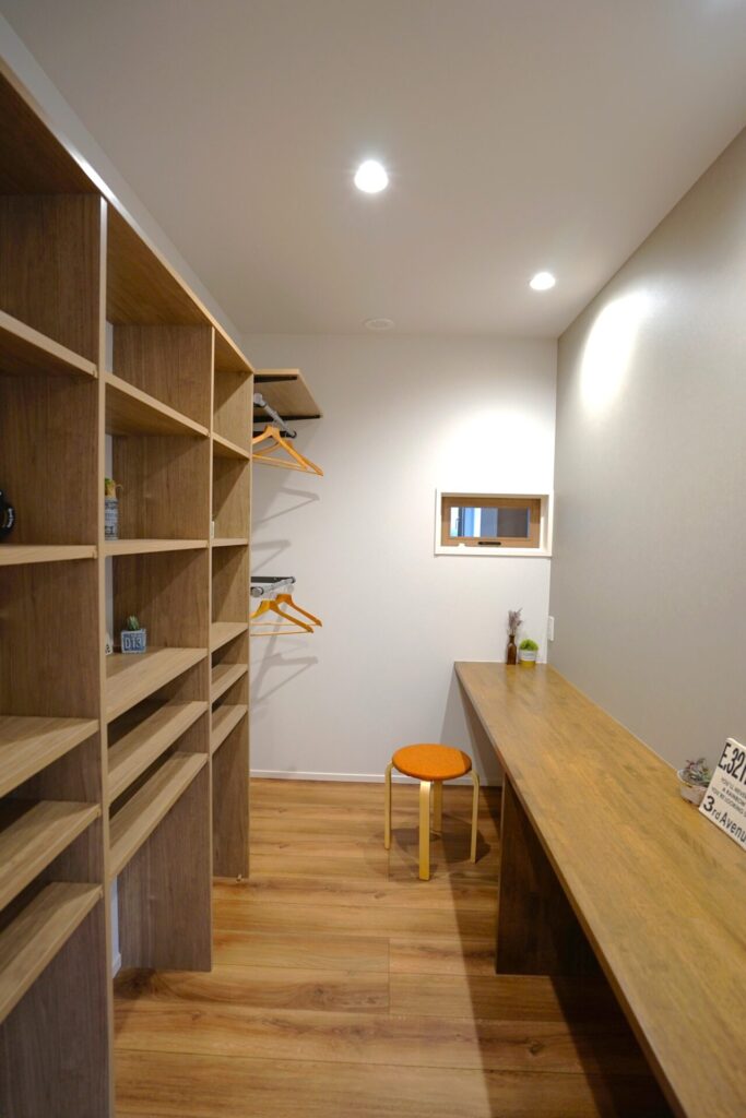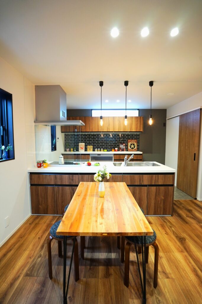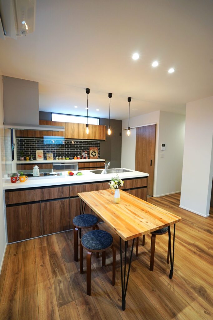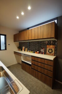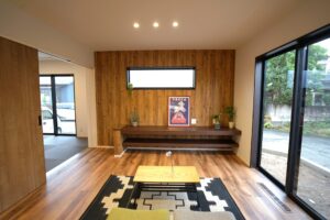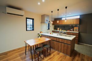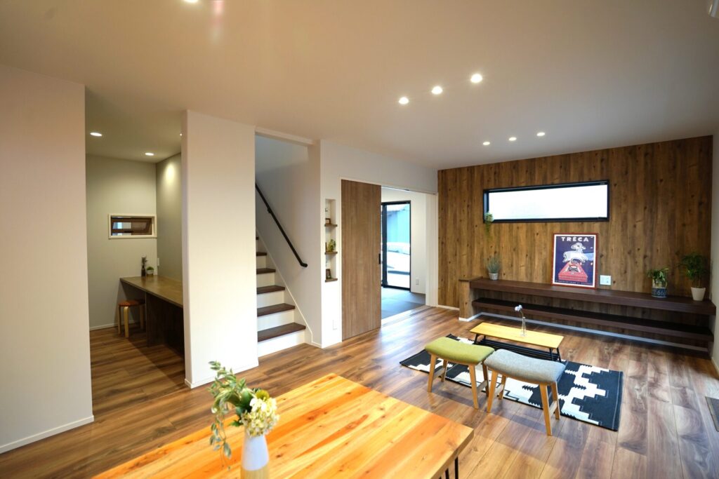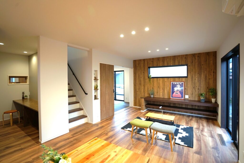 庭を残し四季折々の花を育てる。緑あふれるアウトドアリビングを大空間にし造り付け収納も各所に設け無垢材多く用い、木の温もり感じられる家にしました。心地よい光と風が満ちるリビングには家族が自然と集まりコミュニケーションの場になります。スタディーコーナーもあるのでリビング学習もできます。
